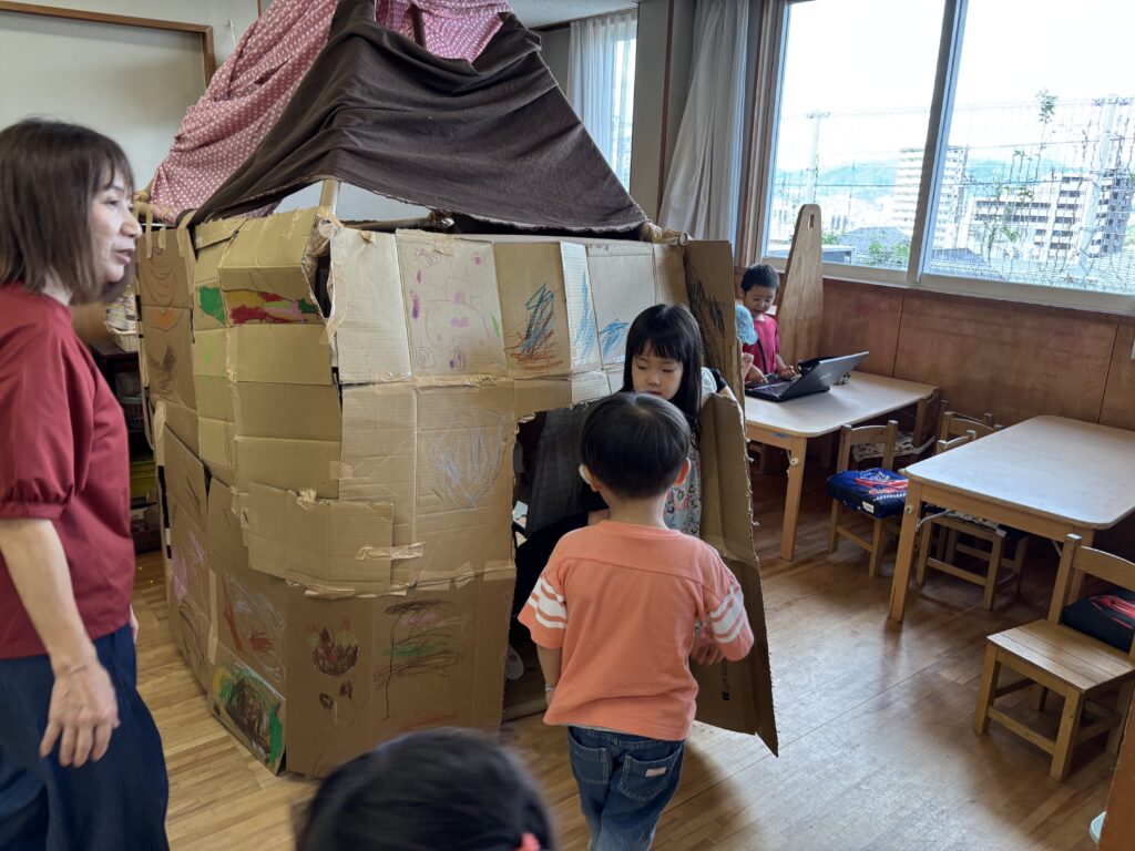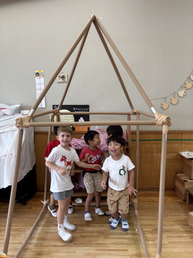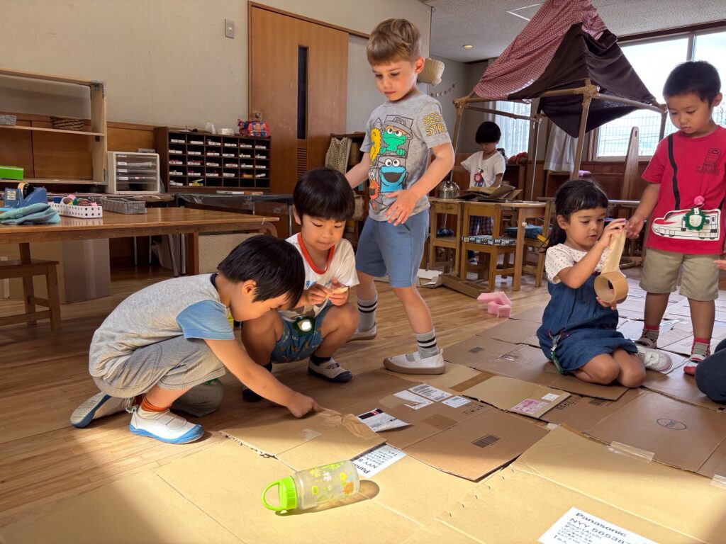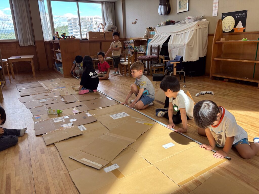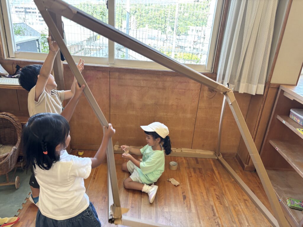 少しずつ形になってきたところでグニャっとダンボールが折れ、崩れてしまいましたが、「明日はもっと強い棒で作ろうよ!」「絶対作ろうね!」と気合に満ち溢れている子どもたち。