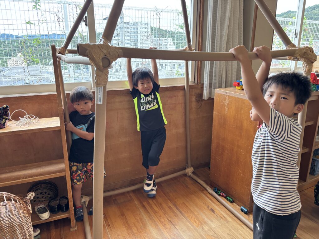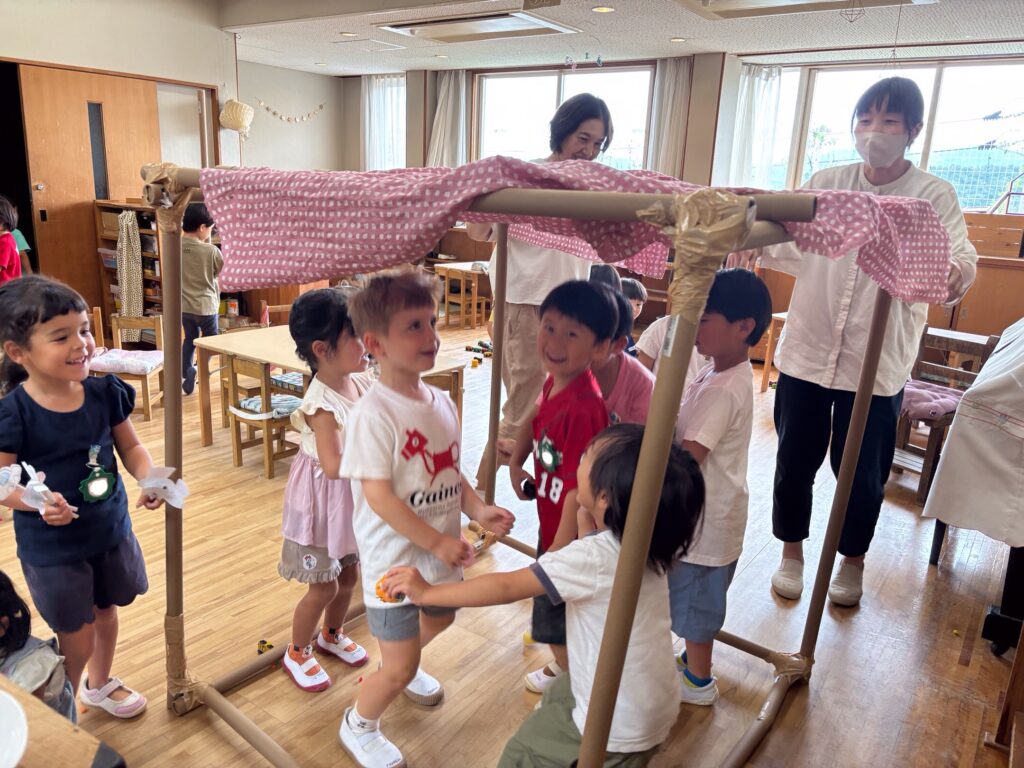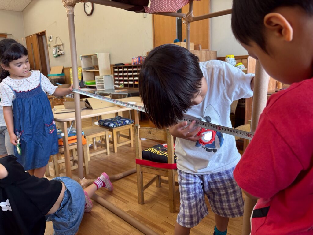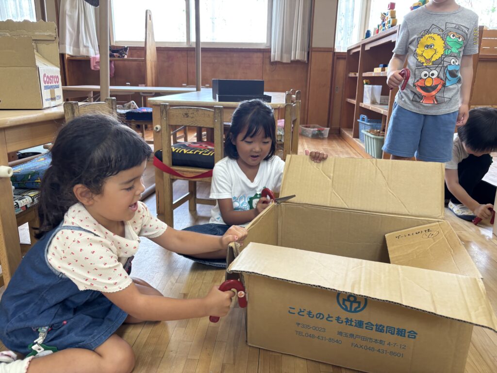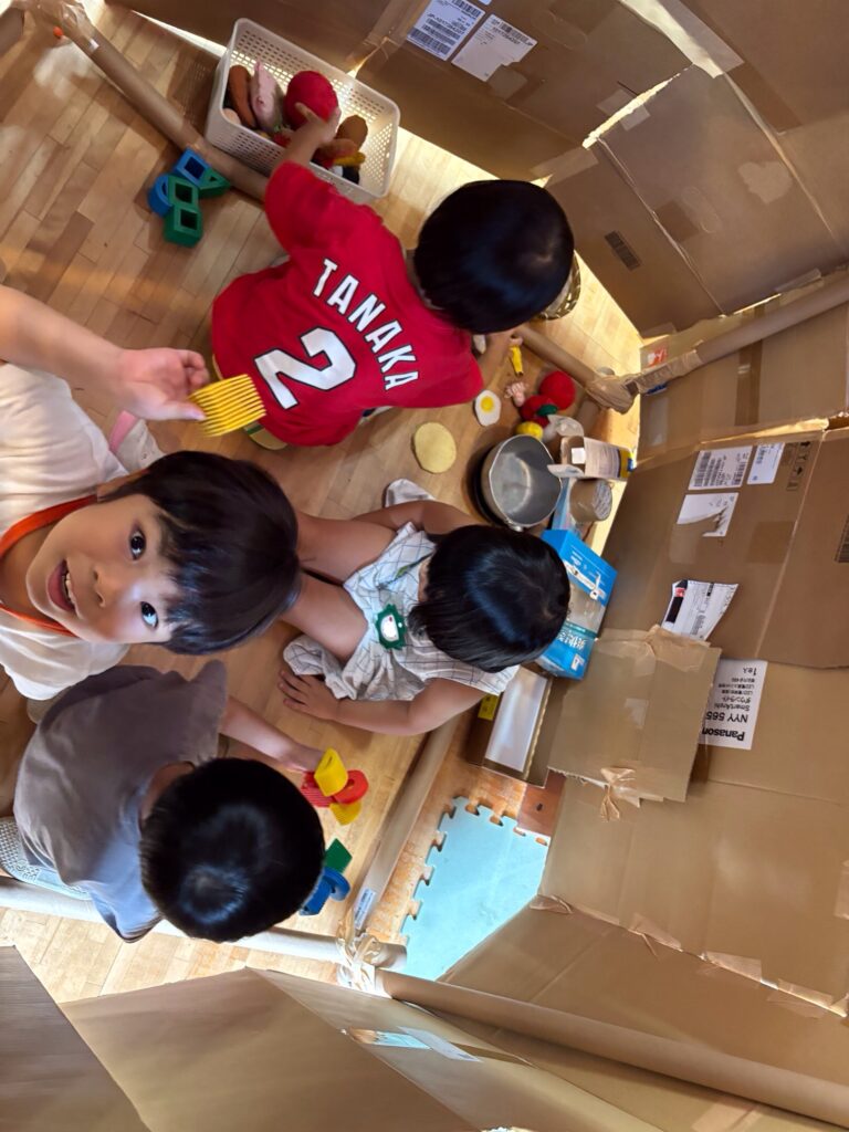 少しずつ形になってきたところでグニャっとダンボールが折れ、崩れてしまいましたが、「明日はもっと強い棒で作ろうよ!」「絶対作ろうね!」と気合に満ち溢れている子どもたち。