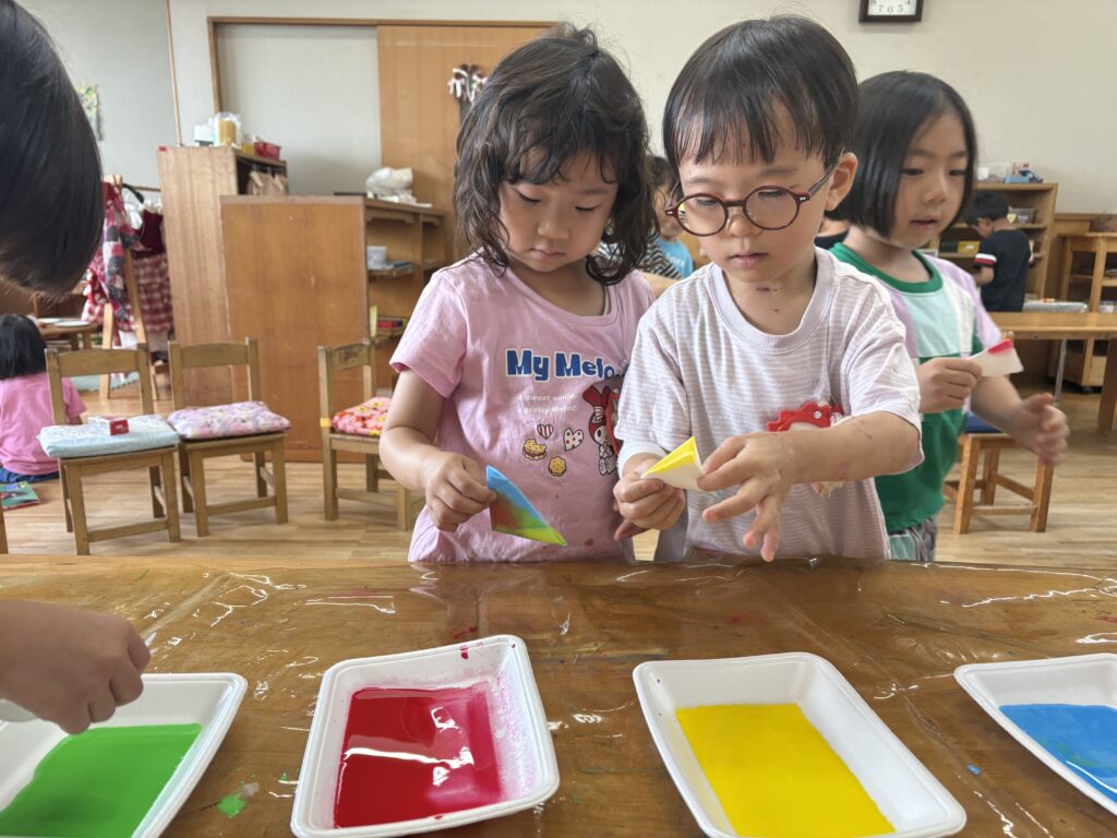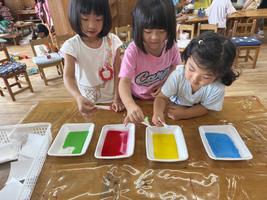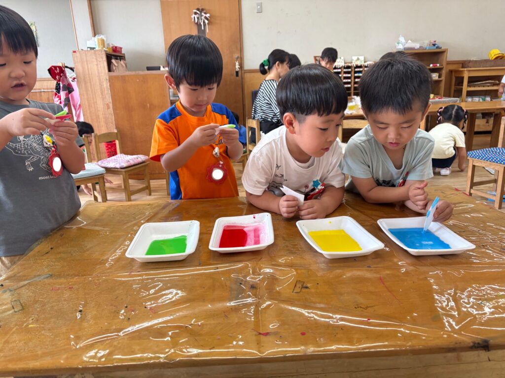 和紙を三角に折って、4色の絵の具で好きなように色付けます。