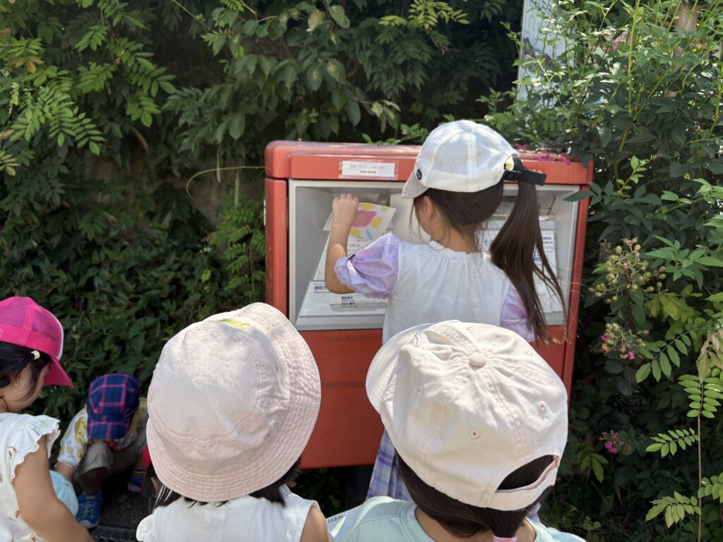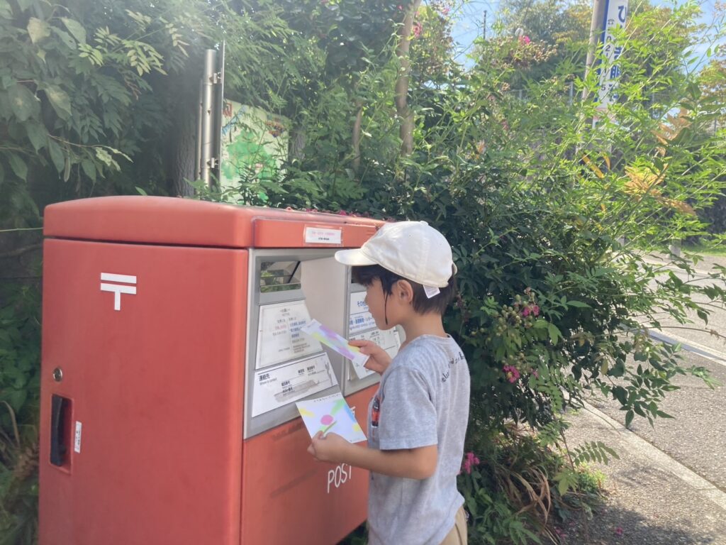 しっかり乾かして、ハガキに貼ったら、みんなでポストに投函しに行きます。