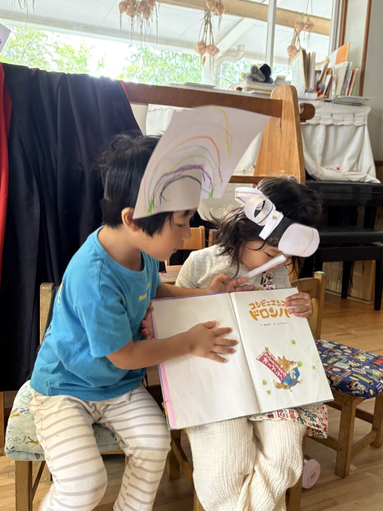 「おばけ劇が始まるよ〜」とはじめは、クラスで親しんでいる「コンビニエンスドロンパ」の読み聞かせ。
