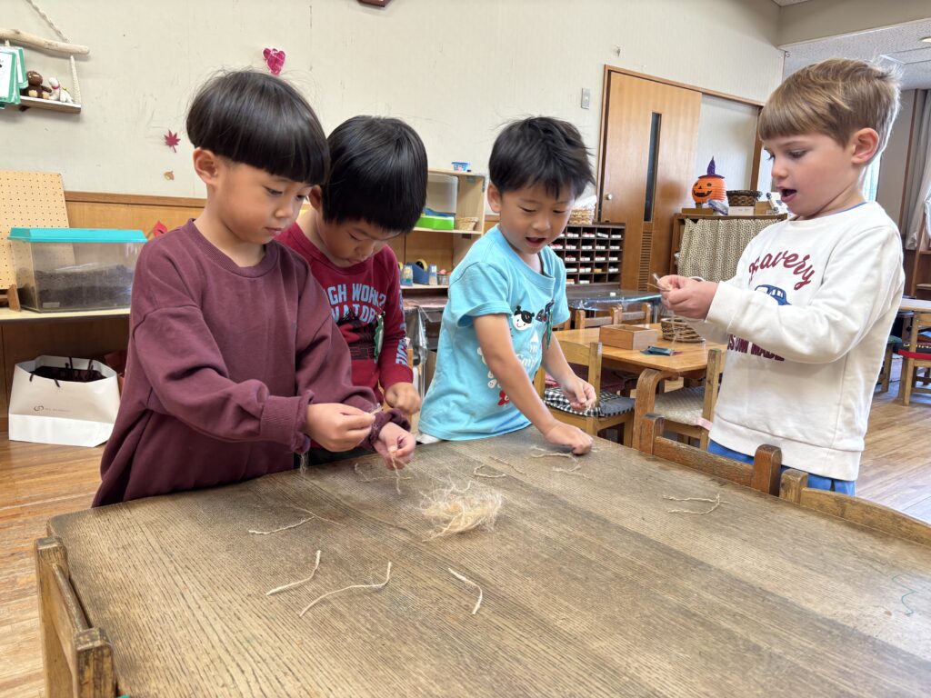麻紐がだんだんと集まってくると「鳥の巣みたい」と面白い形になり、「もっと大きい鳥の巣にしよう!」と、焚き火準備も楽しいひと時。
