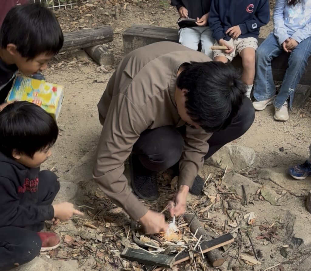 しかし、ファイヤースターターで着火を試みるも、なかなか炎が燃え上がるには至りません。風も冷たく寒さも増す中、心が折れそうになるけれど、子どもたちの声援がどんどん大きく「頑張〜れ!頑張〜れ!」焚き火広場に響き渡ります。やっとの事で、火花が子どもたちの解いた麻紐に移り、火をつけることができ、大歓声!