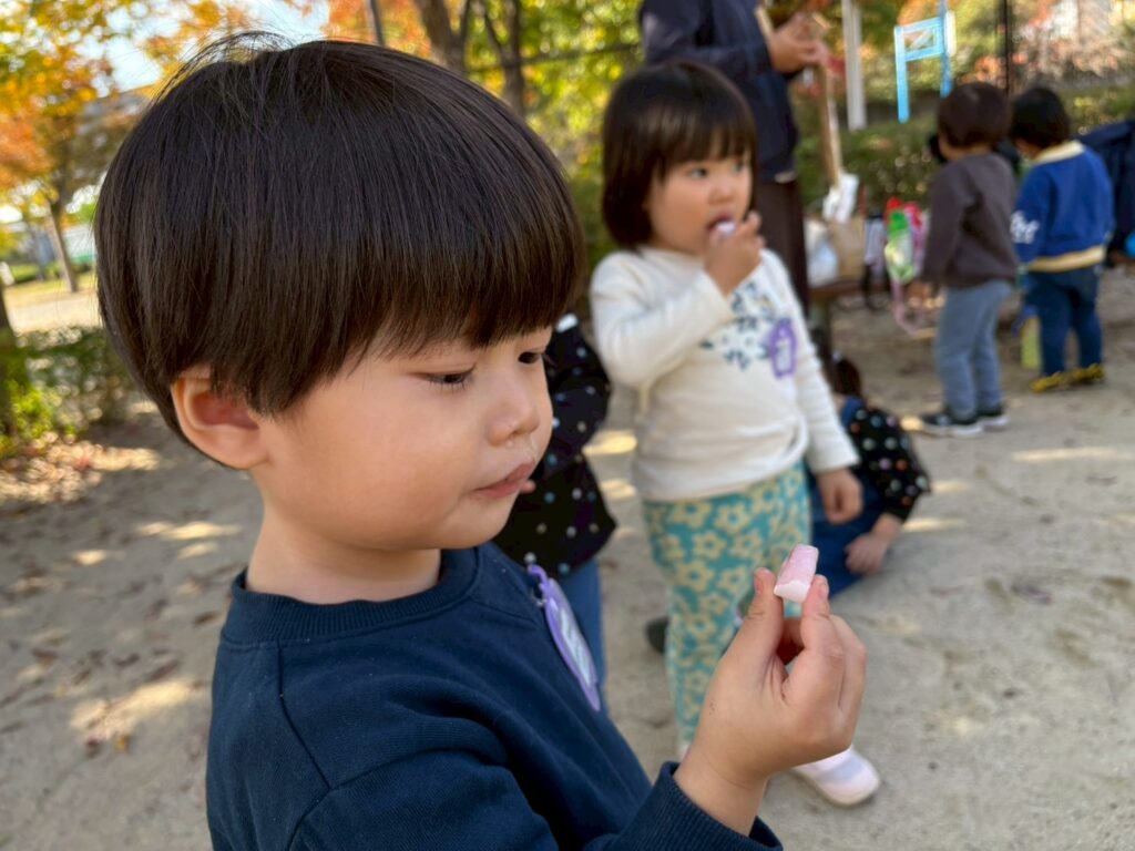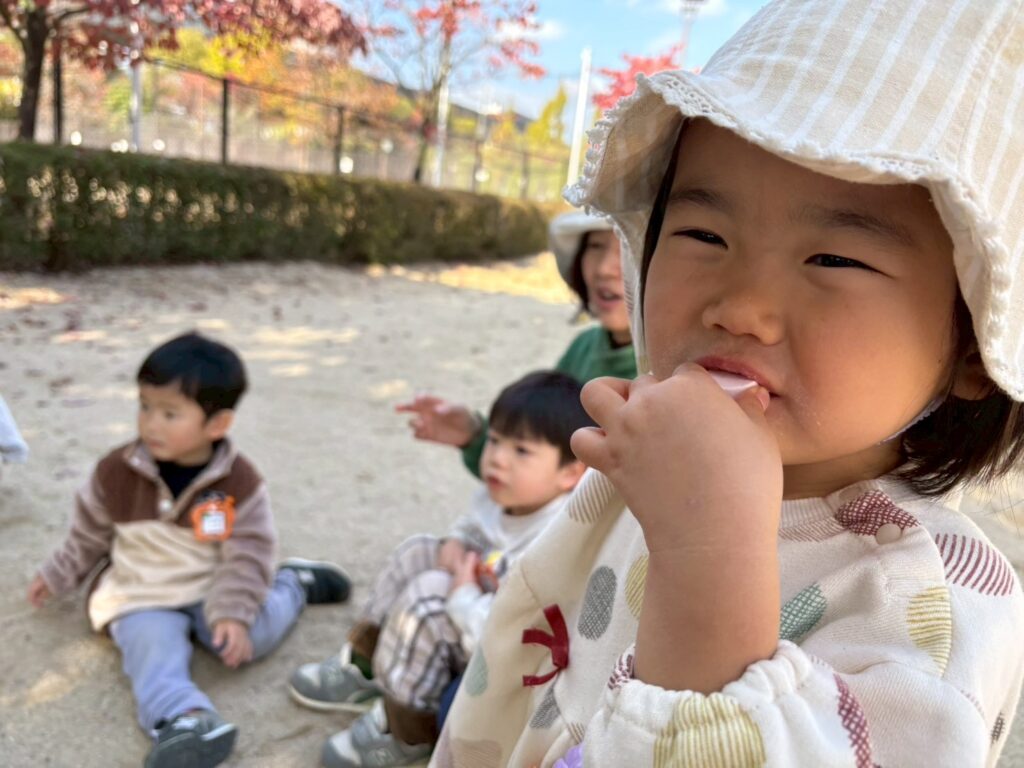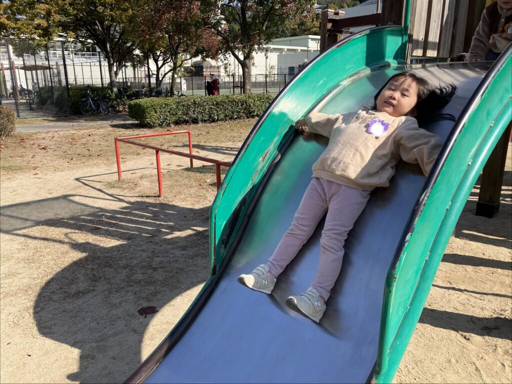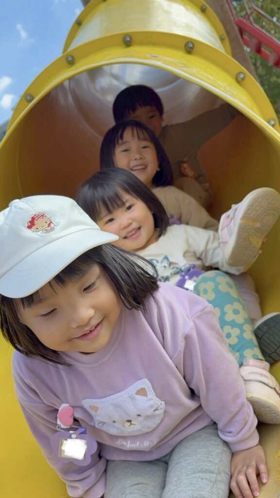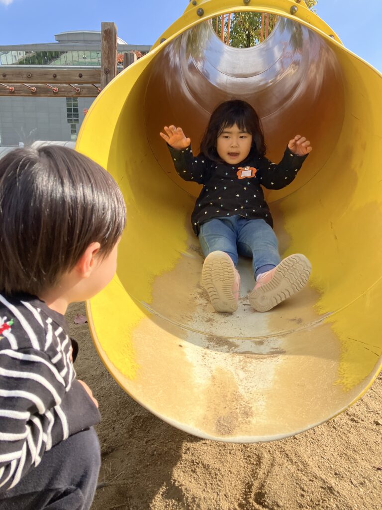 ブランコも滑り台もお砂場もいっぱい遊んで、かくれんぼもして楽しかったなあ。そろそろ幼稚園に帰ろっか