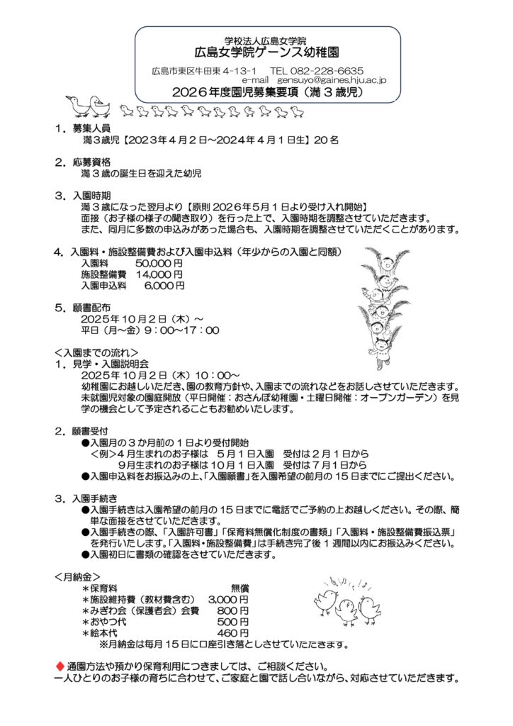 NEWS お知らせ 2025.09.22 満3歳児2025年度入園 随時募集中 若干名の受け入れ、受付いたしております。 対象年齢の方は、園に直接お問い合わせください。 電話番号:082-228-6635 メール:gensuyo@gaines.hju.ac.jp お知らせ一覧 前のページに戻る